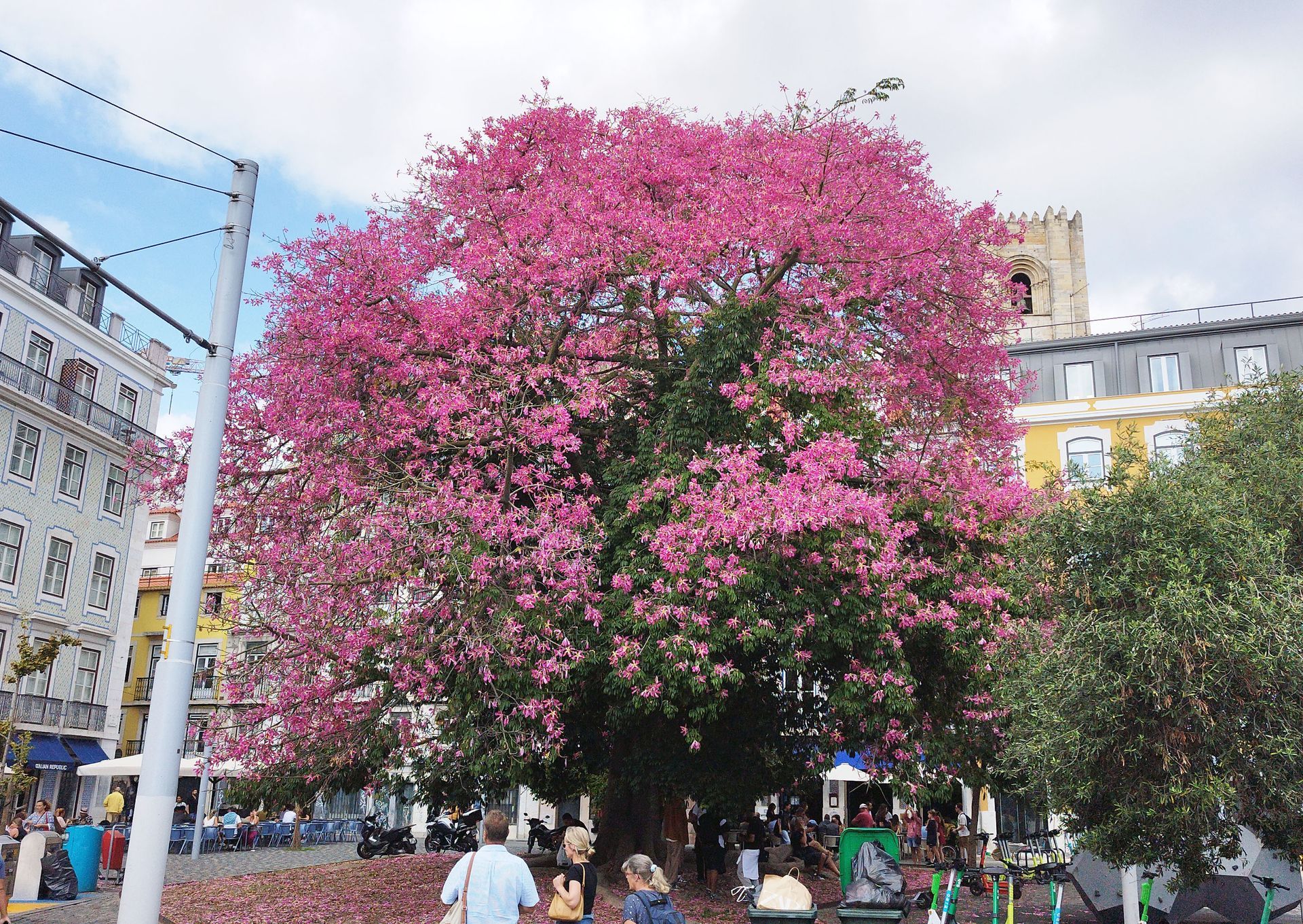 O exemplar das fotos, está no Largo José Saramago, perto do Campo das Cebolas. A sua dimensão e a profusão de flores é tal, que se torna num ponto de paragem obrigatório para quem passa. Nos breves 5 minutos em que lá estive, foram inúmeras as pessoas que interromperam a caminhada para o fotografar. Aqui e ali, a folhagem toca nas cabeças de quem circula debaixo e as flores no chão são tantas que é impossível não pisar, mas ninguém parece se importar.