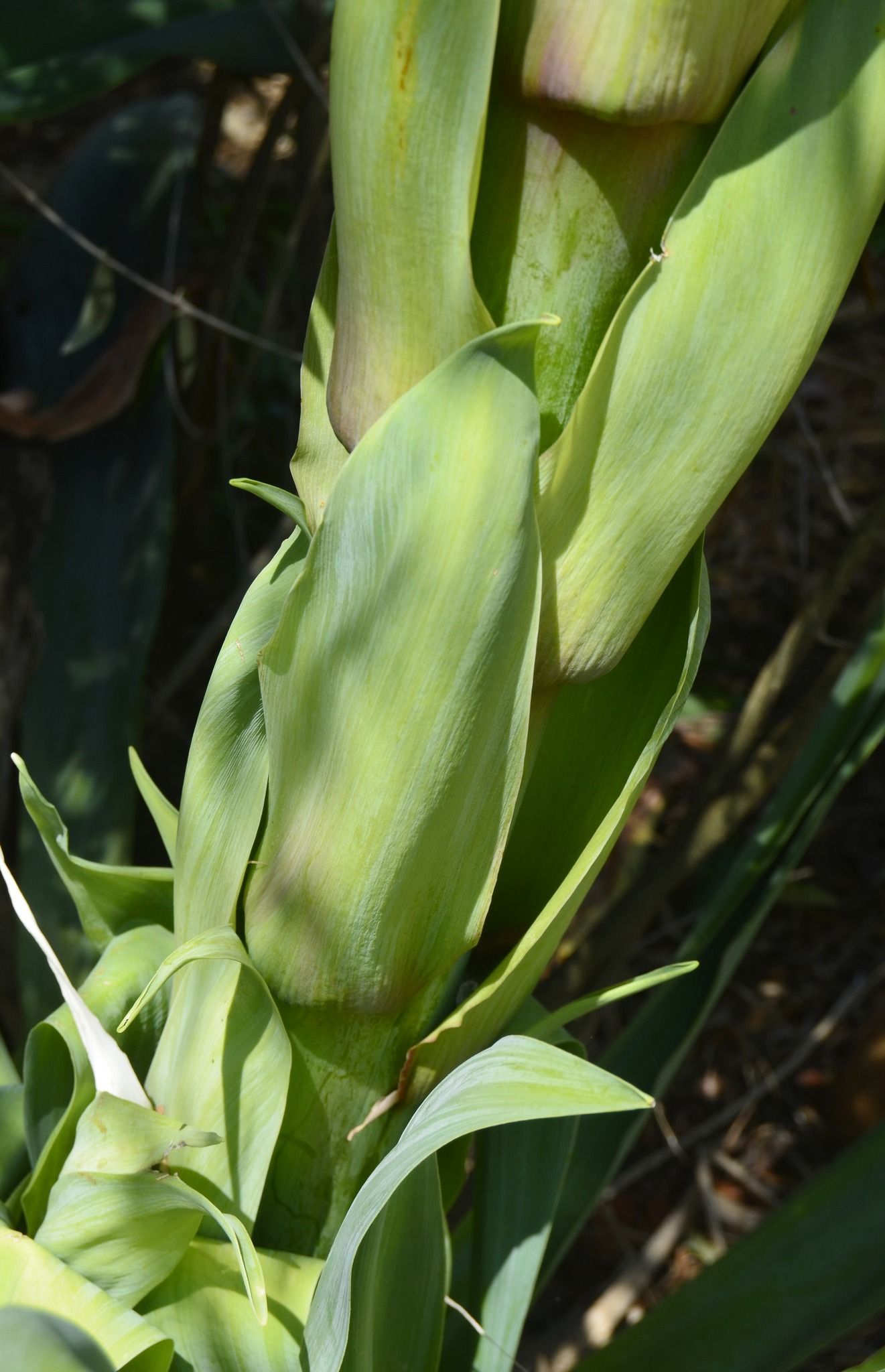 A inflorescência em panícula, rosa ou avermelhada, pode alcançar facilmente os 2 m e ter até 20 ramificações, de onde pendem flores esverdeadas de 4 - 8,5 cm de comprimento. Ao contrário de outras plantas semelhantes da família, como agaves ou furcreias, não morre após a floração, da sua base aparecem alguns rebentos que florescem nos anos seguintes.